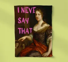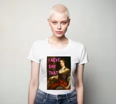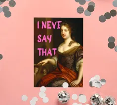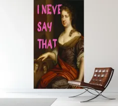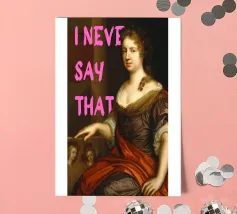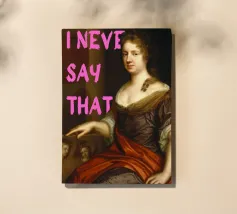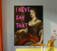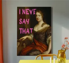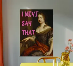 Iniettate una dose di sottile umorismo nel vostro spazio con "I Never Say That", una spiritosa stampa pop art che giustappone sapientemente un ritratto classico a una frase moderna e attuale. Questa accattivante opera d'arte presenta una figura storica serena, con uno sguardo diretto e consapevole, elegantemente in posa accanto a ritratti in miniatura. Il testo in grassetto, di colore rosa caldo, "I NEVER SAY THAT" (Non lo dico mai) si sovrappone all'immagine, creando un commento umoristico sui pensieri non detti e sulle convenzioni sociali. È una miscela perfetta di eleganza senza tempo e arguzia contemporanea, ideale per aggiungere personalità e un tocco di spensieratezza a qualsiasi interno moderno. Realizzato