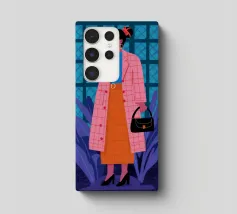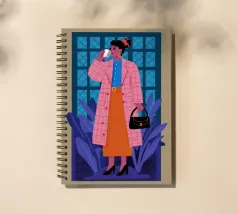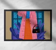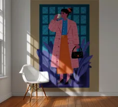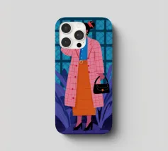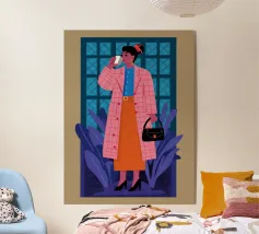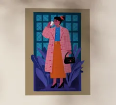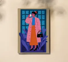 Una donna elegante con cappotto e cappello rosa acceso si trova di notte davanti a una finestra, con in mano un telefono, in una scena al tempo stesso chic e misteriosa.