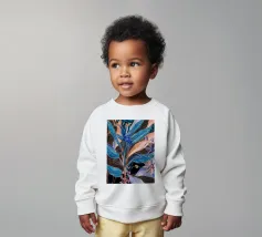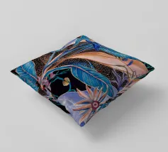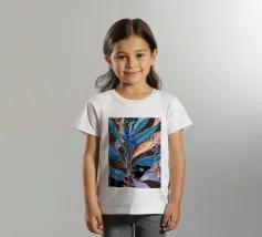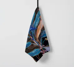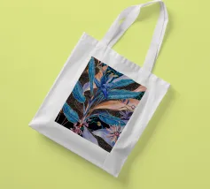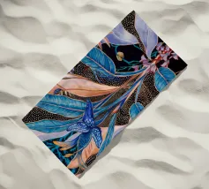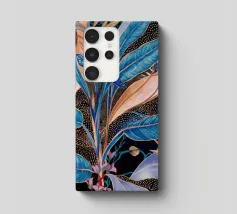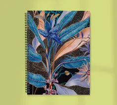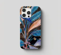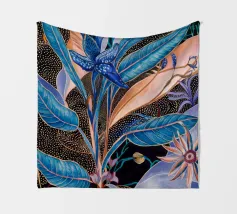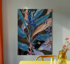 Raffigurazione stilizzata di una pianta tropicale con foglie blu e accenti floreali rosa o viola, su uno sfondo scuro illuminato da punti dorati sparsi, che creano un effetto di fioritura notturna.