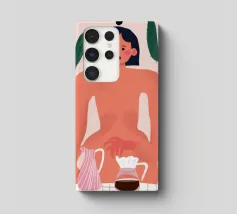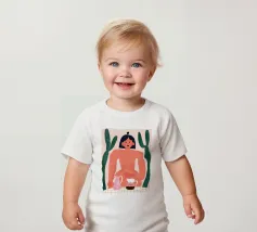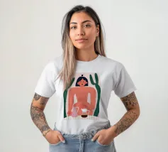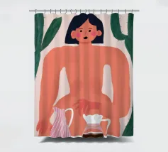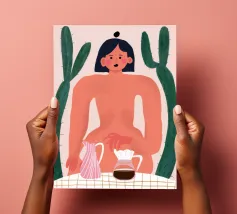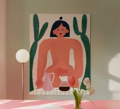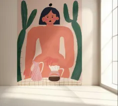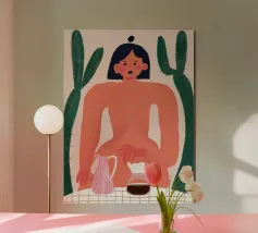 Nudo artistico moderno di una donna seduta a terra, con in mano una brocca bianca. Le forme semplici e i colori delicati creano uno studio sereno, elegante e bello della forma umana.