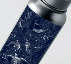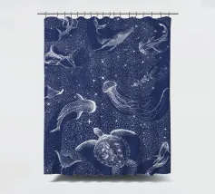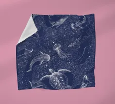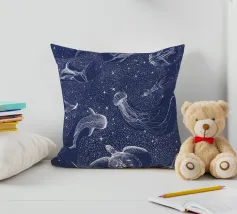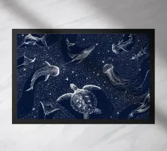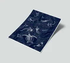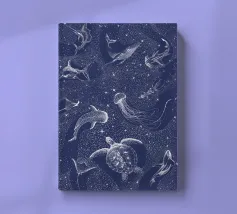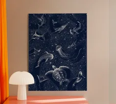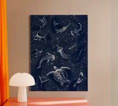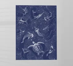 Creature subacquee che nuotano in un oceano di stelle. Balene, razze, tartarughe verdi, razze, squali balena e squali danzano intorno alle stelle.