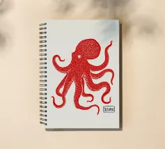 Un'audace illustrazione in bianco e nero di un polpo rosso con tentacoli fluenti, su uno sfondo beige minimalista. La composizione dinamica è accentuata da un timbro rosso con la scritta "Octopus", che aggiunge un raffinato tocco artistico.