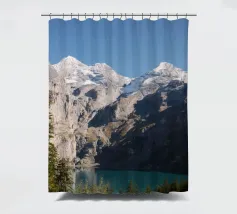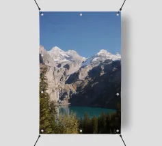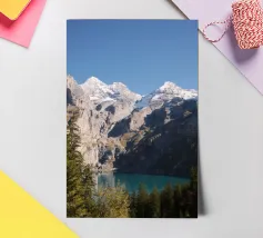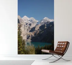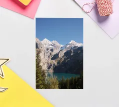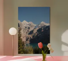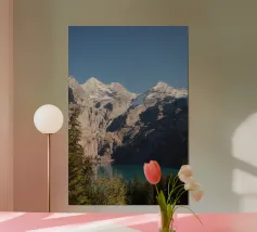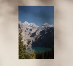 Una calma mattina d'autunno sull'Oeschinensee, dove l'acqua turchese incontra le imponenti Alpi Bernesi. La luce frizzante, le scogliere scoscese e la foresta silenziosa creano una scena di montagna senza tempo, che cattura l'essenza pacifica della bellezza alpina della Svizzera.