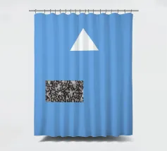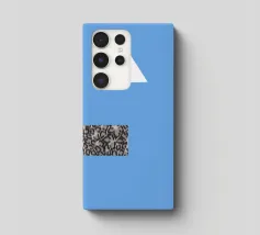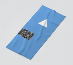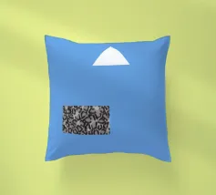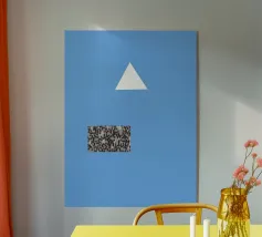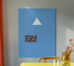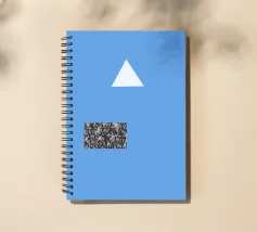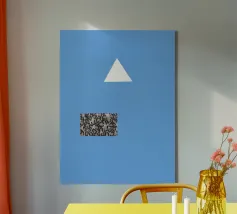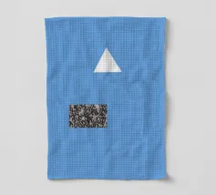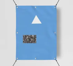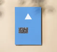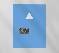 Un triangolo bianco fluttua sopra un motivo rettangolare in bianco e nero su uno sfondo blu pieno. La composizione è minimalista, con colori contrastanti e forme geometriche che creano interesse visivo.