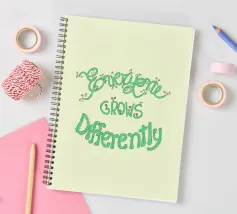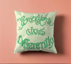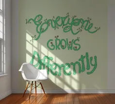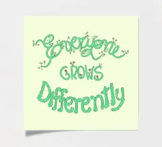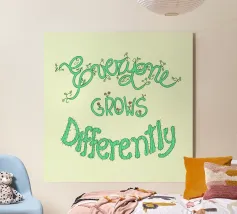 Le scritte di quest'opera riflettono la diversità della crescita: "Everyone" si attorciglia intorno a delicate viti, "Grows" fiorisce con piccoli boccioli e "Differently" cresce forte come un cactus resistente. Questo disegno trasmette il messaggio che ognuno cresce a modo suo, con leggerezza, sbocciando dolcemente o affrontando sfide spinose. Perfetto per chi apprezza la conoscenza di sé, lo sviluppo personale e la bellezza unica di ogni viaggio.