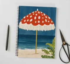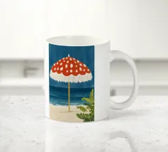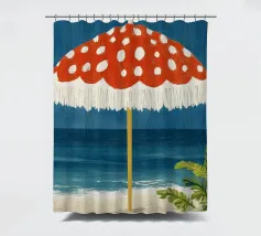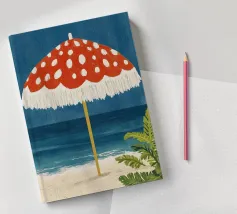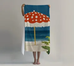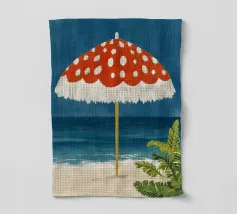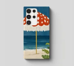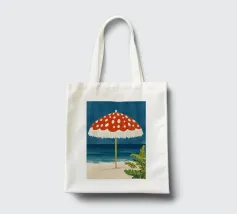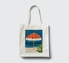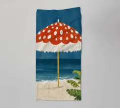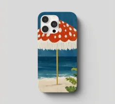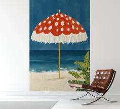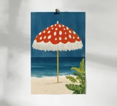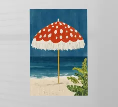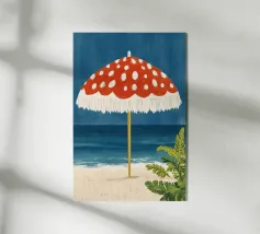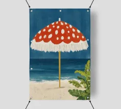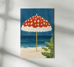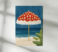 L'immagine mostra una spiaggia idilliaca con un grande ombrellone in primo piano. L'ombrellone ha una superficie rossa con puntini bianchi ed è decorato con frange bianche che gli conferiscono un affascinante aspetto vintage. Alle sue spalle si estende il mare calmo, mentre alcune piante verdi completano l'immagine in basso a destra. Lo stile è illustrativo e materico, una scena amorevolmente dipinta a mano che emana un'atmosfera calda e nostalgica.
