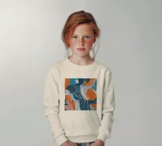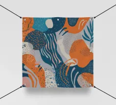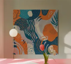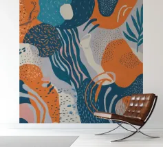 Un bellissimo motivo astratto caratterizzato da linee fluide e ondulate e da forme organiche con dettagli strutturati in una tavolozza rilassante di blu, arancione e beige, che suggerisce dolci onde o colline.