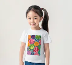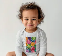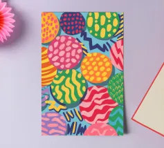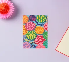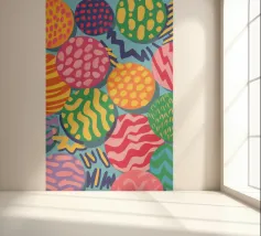 Un motivo vivace e giocoso è composto da sfere colorate che si sovrappongono, ognuna delle quali è ricca di texture e motivi unici, creando un pezzo astratto visivamente stimolante e gioioso.