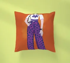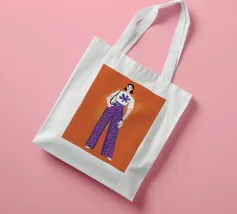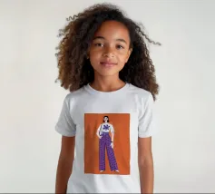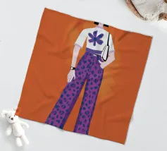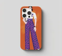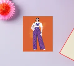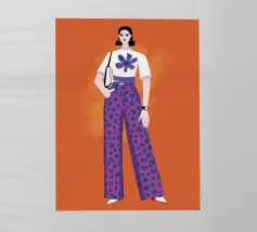 Ritratto a figura intera di una donna elegante che indossa pantaloni a fantasia colorata e un top bianco con un singolo fiore viola. La sua posizione sicura e la palette di colori retrò conferiscono al pezzo un'atmosfera fresca e ispirata agli anni '70.