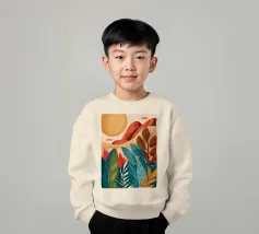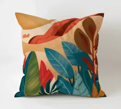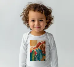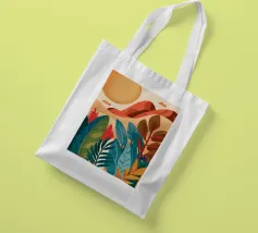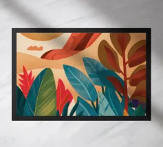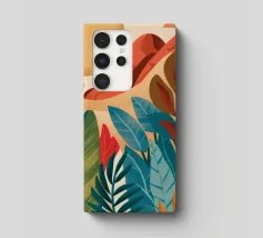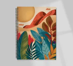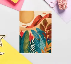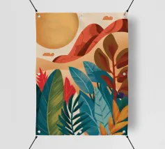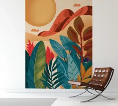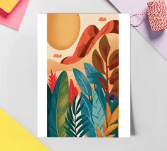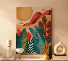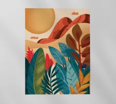 Un paesaggio astratto moderno e sereno con un sole al tramonto su foglie e colline stilizzate in una tavolozza di colori caldi e terrosi di ocra, terracotta e verde. La composizione è calma, equilibrata e sofisticata.