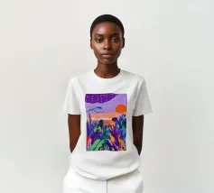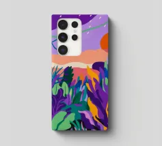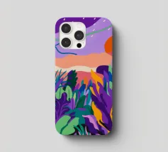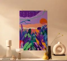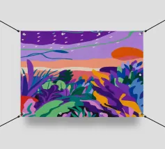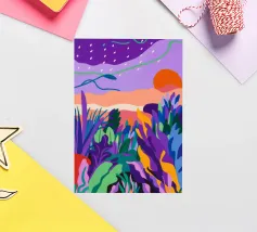 Un paesaggio tranquillo si illumina di viola al crepuscolo, mentre la natura riposa sotto le stelle.