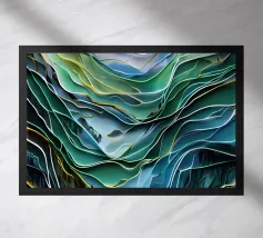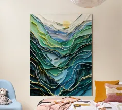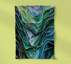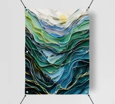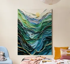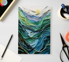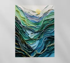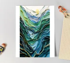 Questa accattivante opera d'arte astratta utilizza carta stratificata e tinte vivaci per creare un paesaggio ipnotico. I dettagli intricati e i colori armoniosi evocano un senso di tranquillità e pace.