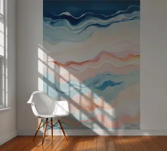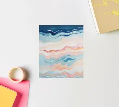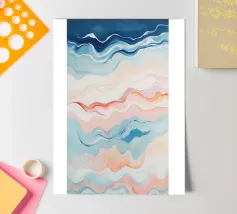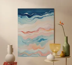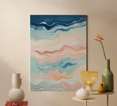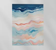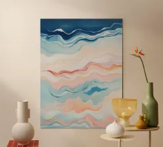 Questo affascinante dipinto astratto evoca un senso di tranquillità e pace. Le morbide tonalità del blu, del rosa e del bianco si intrecciano in onde fluide e ritmiche che ricordano orizzonti infiniti. I colori rilassanti e le forme delicate dell'opera creano un'atmosfera serena, invitando gli spettatori a rifugiarsi in un mondo di calma e contemplazione.