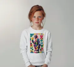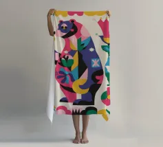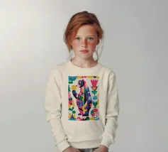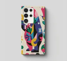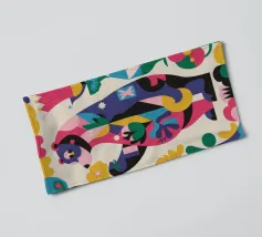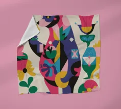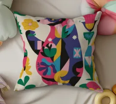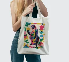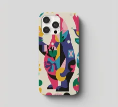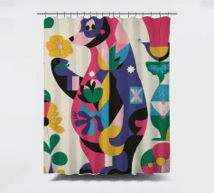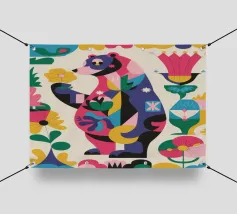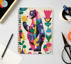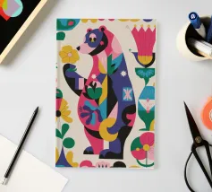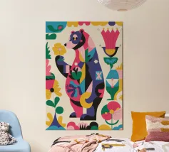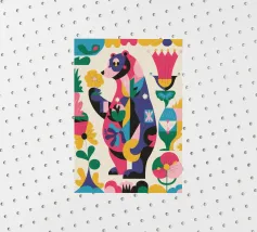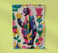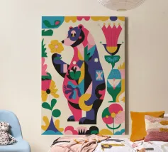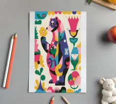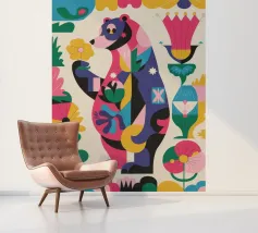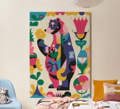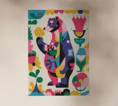 Un orso colorato in piedi tra vari fiori e piante astratte. L'orso è raffigurato in modo stilizzato con forme geometriche e colori vivaci.