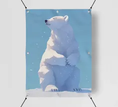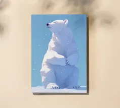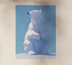 Una serena illustrazione digitale di un maestoso orso polare seduto pacificamente nella gelida natura selvaggia. La sua folta pelliccia risplende sullo sfondo innevato, catturando l'essenza della bellezza e della solitudine artica. Ideale per gli amanti dell'arte della fauna selvatica, per i progetti a tema naturalistico e per i messaggi di conservazione.