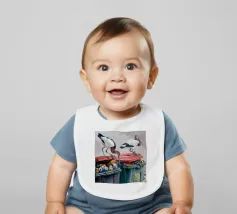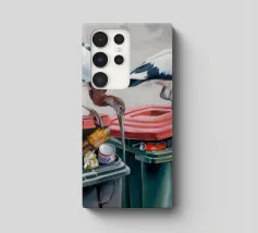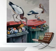Due ibis bianchi sono appollaiati in cima a bidoni della spazzatura verdi e traboccanti, mentre si rovistano in mezzo a una collezione colorata di lattine e bottiglie abbandonate. La scena cattura un momento crudo e inaspettato di natura in un ambiente urbano.