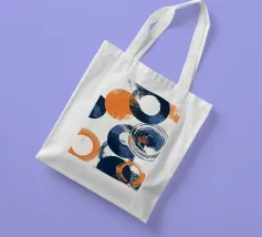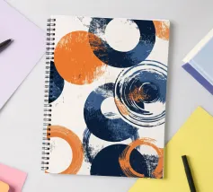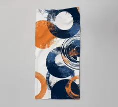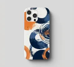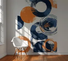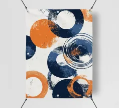 Audaci cerchi sovrapposti in blu e arancione creano un motivo dinamico su uno sfondo chiaro. I bordi ruvidi e strutturati conferiscono un senso di movimento ed energia.