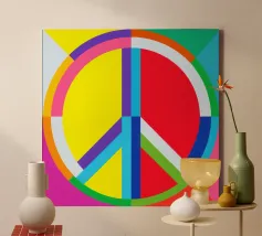 Questo vibrante simbolo di pace celebra la diversità attraverso colori spettacolari. Ogni segmento risplende in colori diversi. La precisione geometrica e la nitida piattezza ricordano la pittura d'avanguardia e la pop art degli anni '60, mentre l'iconico segno della pace simboleggia una speranza senza tempo. L'unione armoniosa di tutti i colori del cerchio è sinonimo di inclusione, accettazione ed energia creativa. Un'affermazione ottimistica che riempie gli ambienti di energia positiva e ci ricorda il potere della comunità e del rispetto reciproco: un'attualità senza tempo e visivamente accattivante.