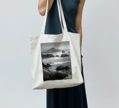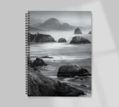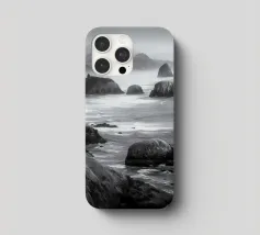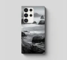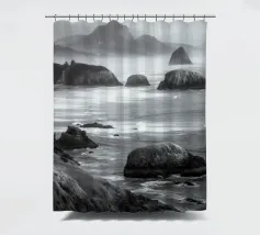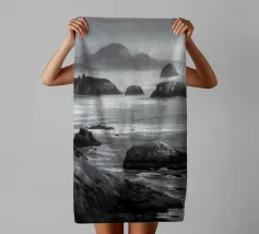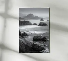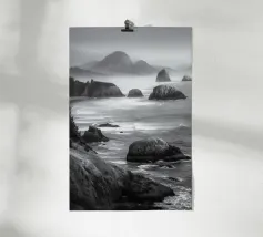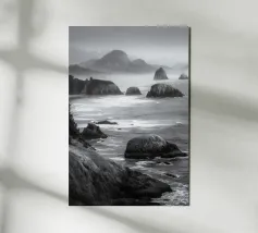 Catturate l'aspra bellezza di una costa nebbiosa con questa suggestiva opera d'arte in bianco e nero, caratterizzata da iconici faraglioni e onde che si infrangono. Perfetto per aggiungere un tocco potente e drammatico a qualsiasi spazio.