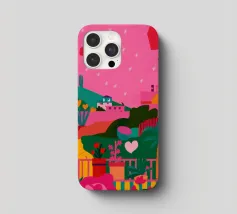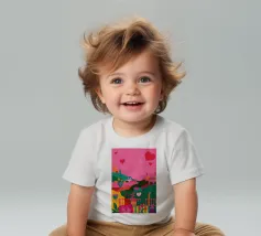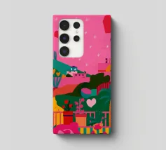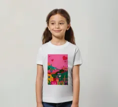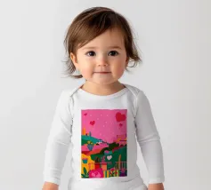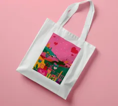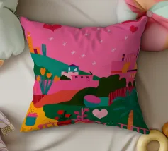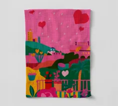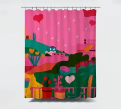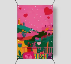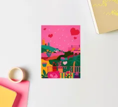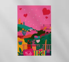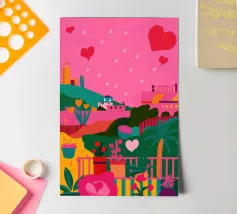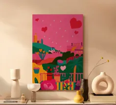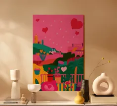 Un paesaggio stravagante è caratterizzato da dolci colline rosa sotto un cielo pieno di cuori fluttuanti, creando un dolce, romantico e fantasioso "paesaggio dell'amore".