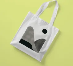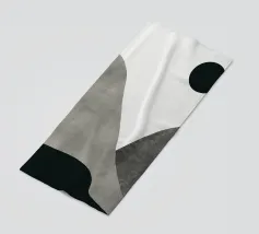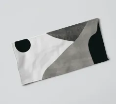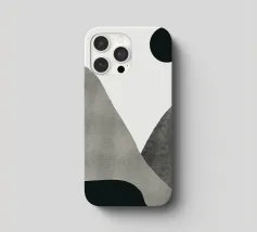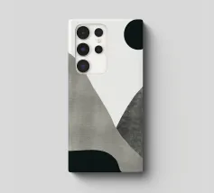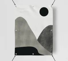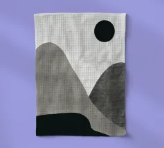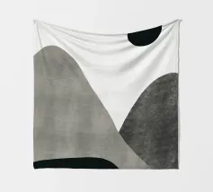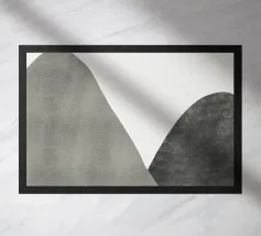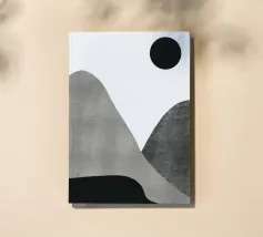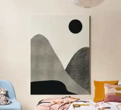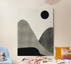 Un paesaggio minimalista presenta due montagne astratte in tonalità di grigio su uno sfondo bianco, con un cerchio nero pieno che ricorda il sole o la luna. Le forme semplici e i colori tenui creano un'estetica moderna e rilassante.