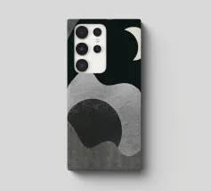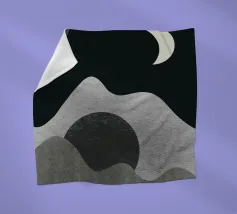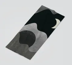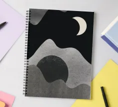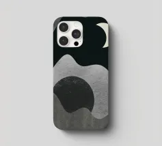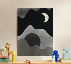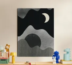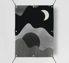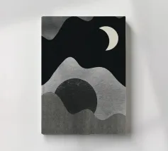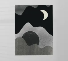 Una luna crescente fluttua in un cielo scuro sopra forme grigie astratte e ondulate, che evocano montagne o paesaggi. Il design minimalista utilizza aree chiare e scure contrastanti per creare un senso di profondità e mistero.