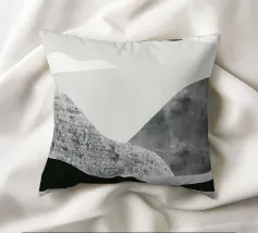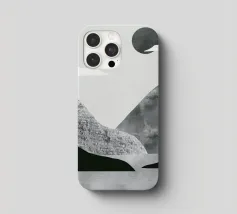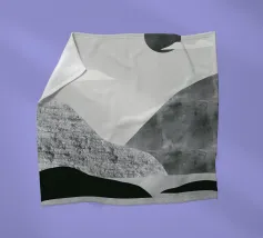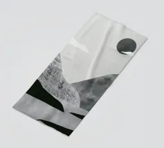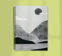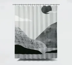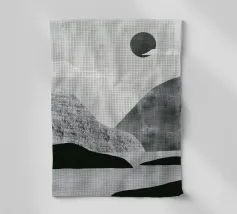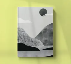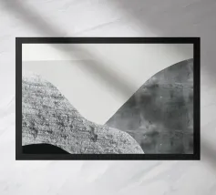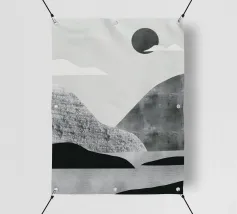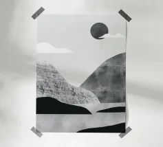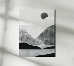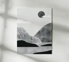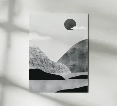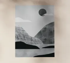 Un paesaggio minimalista è caratterizzato da colline ondulate e da un sole deciso su uno specchio d'acqua sereno, il tutto reso in toni monocromatici. Semplici forme geometriche e sfumature di grigio trasmettono una rappresentazione tranquilla e astratta della natura.