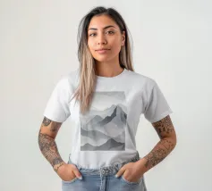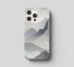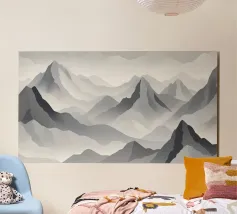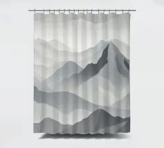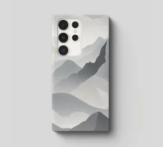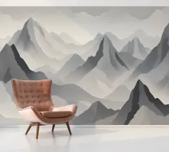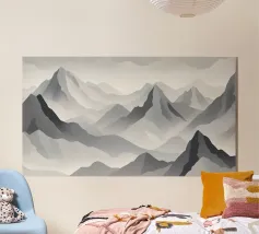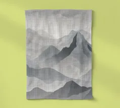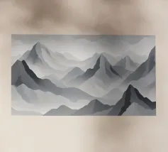 Un'affascinante catena montuosa appare nei toni del grigio, evidenziando le cime e le valli. Le morbide transizioni tra i toni creano un'atmosfera serena e misteriosa.