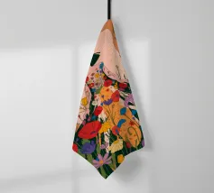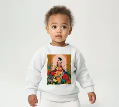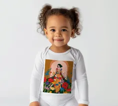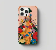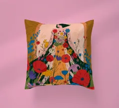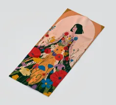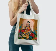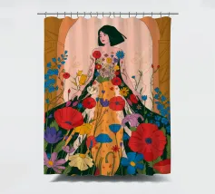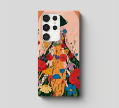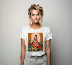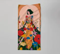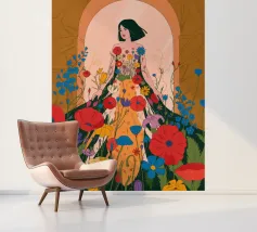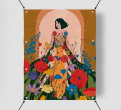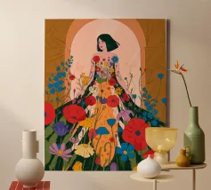 Questo dipinto presenta una figura con un abito fatto di fiori vivaci. Lo sfondo è pieno di altri fiori, creando un'atmosfera onirica e colorata che celebra la natura e la bellezza.