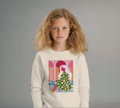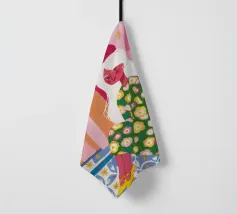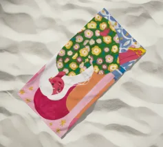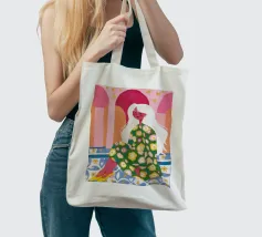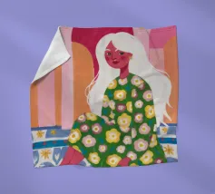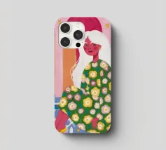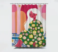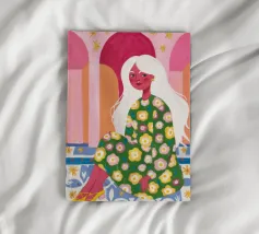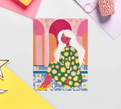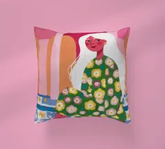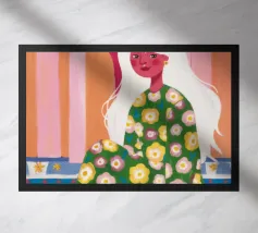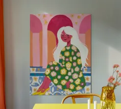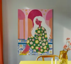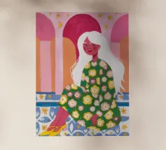 Il dipinto raffigura una figura seduta in un ambiente vivace e ricco di motivi floreali. Lo sfondo è caratterizzato da archi e colonne con tonalità rosa e arancioni, mentre la figura è adornata da un abito con fiori verdi e gialli.