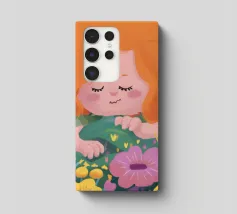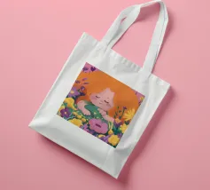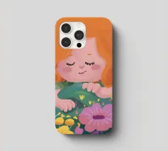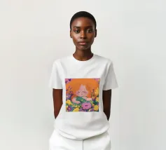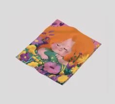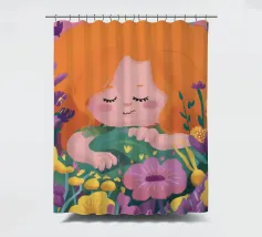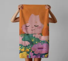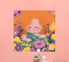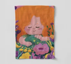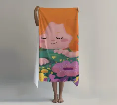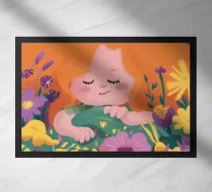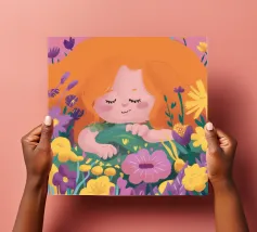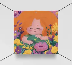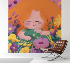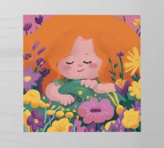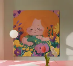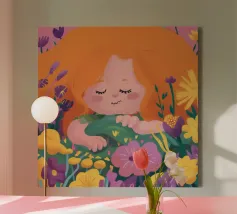 Questa opera d'arte mostra una persona con i capelli arancioni circondata da fiori vivaci di vari colori, tra cui viola, giallo e rosa. La persona sembra essere in uno stato di relax, aggiungendo una qualità sognante e stravagante al dipinto.