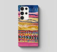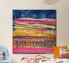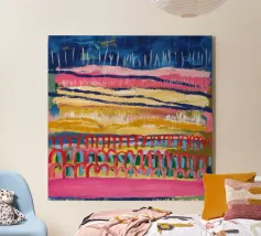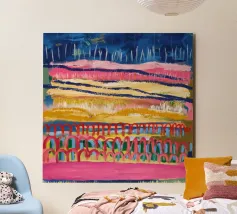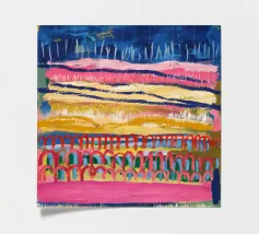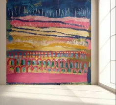 Un dipinto di paesaggio astratto caratterizzato da bande orizzontali di blu intenso nella parte superiore, che passano a gialli, rosa e arancioni, con un primo piano strutturato che suggerisce un campo o un fitto fogliame sotto un cielo vibrante.