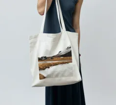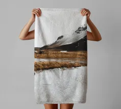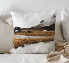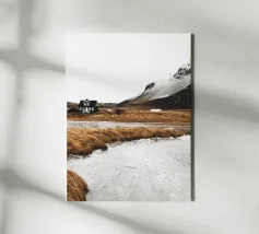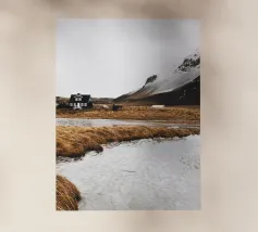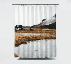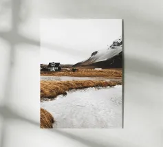 Questo bellissimo motivo di un paesaggio scandinavo mostra una scena tranquilla con una casa tradizionale nera e una vetta innevata sullo sfondo. I toni caldi e terrosi dell'erba e la calma distesa d'acqua creano un'atmosfera armoniosa e invitante che cattura il fascino della natura nordica. Ideale per gli amanti dello stile scandinavo che apprezzano la naturalezza e la tranquillità.