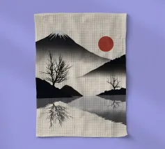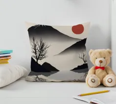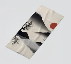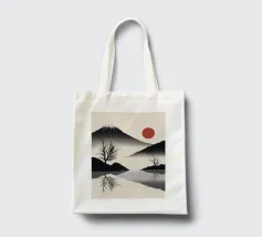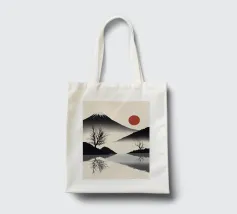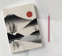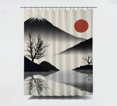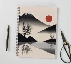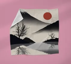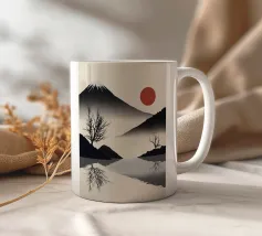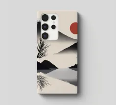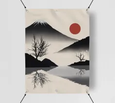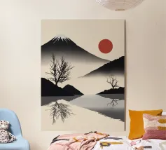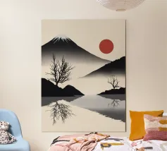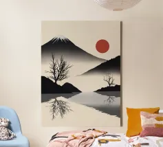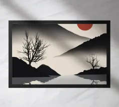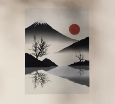 Un paesaggio sereno è caratterizzato da una montagna innevata con un sole rosso in primo piano nel cielo. Gli alberi spogli e i loro riflessi appaiono nell'acqua calma, creando un senso di tranquillità.
