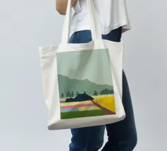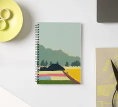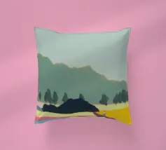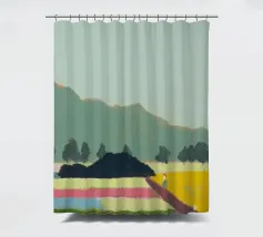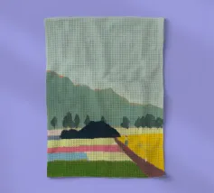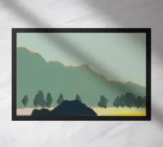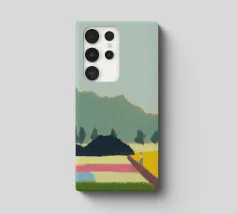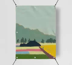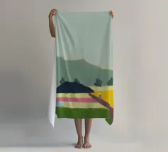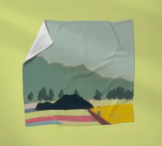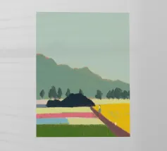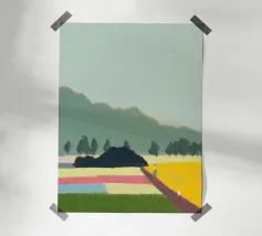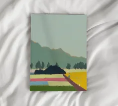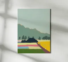 Un paesaggio caratterizzato da dolci colline sullo sfondo e da una persona che cammina su campi colorati in primo piano. Le diverse tonalità di verde, blu, rosa e giallo creano una scena serena e armoniosa.