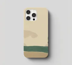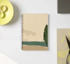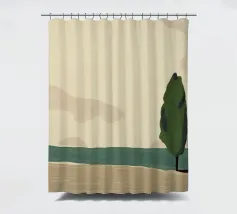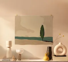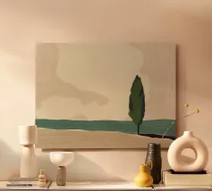 Un albero verde solitario si staglia su uno sfondo di motivi fluidi e beige che ricordano la sabbia o le colline in lontananza. Sotto l'orizzonte, una fascia blu-verde suggerisce la presenza di acqua o di vegetazione rigogliosa, mentre sullo sfondo si intravedono due piccoli tumuli.