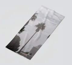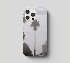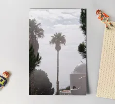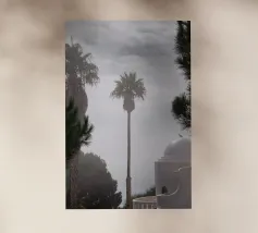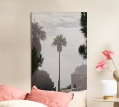 Fotografia di una palma alta e di un piccolo gabbiano su un edificio