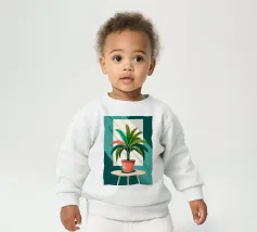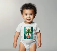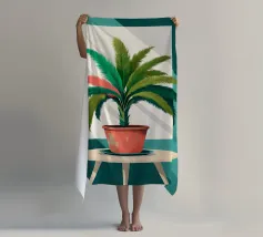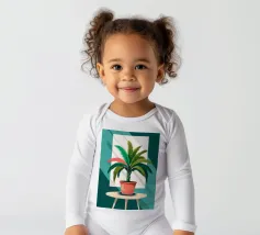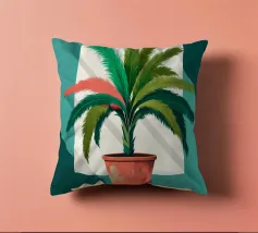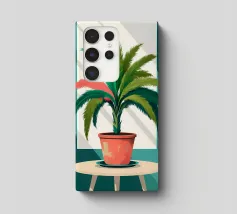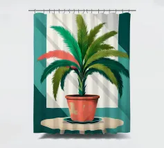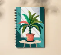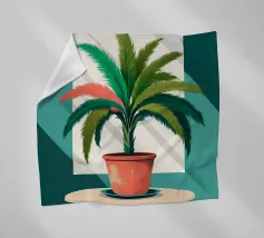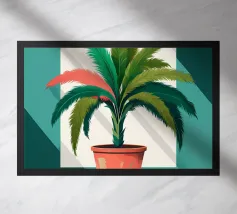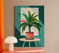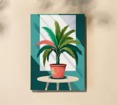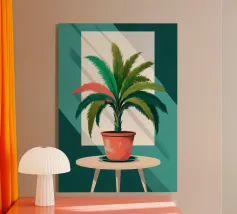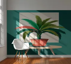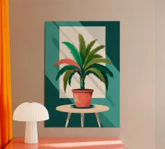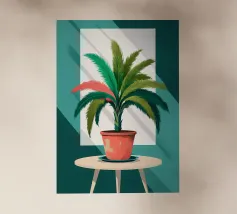 Illustrazione vivace e stilizzata di una pianta di palma in vaso seduta su un tavolo rotondo. La pianta presenta fronde verdi con alcune foglie rosse, sullo sfondo di una finestra che proietta ombre diagonali su una parete verde acqua. Il vaso di terracotta poggia su un piccolo piattino blu.