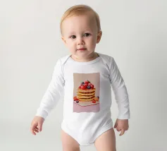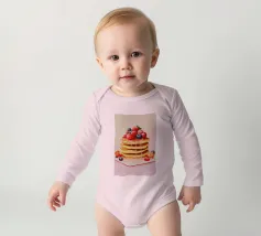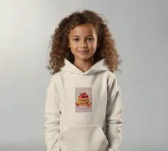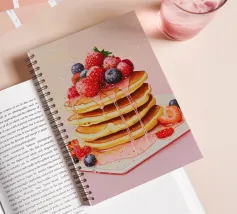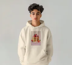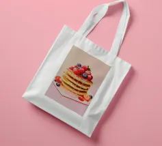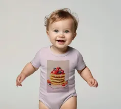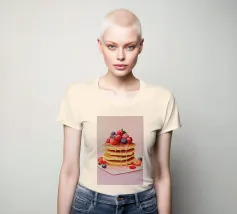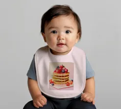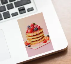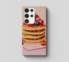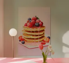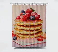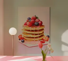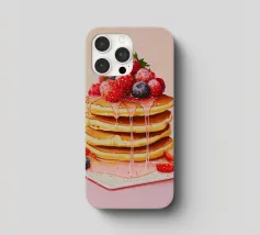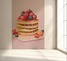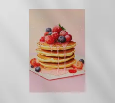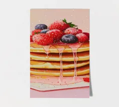 Frittelle dorate impilate, sormontate da frutti di bosco freschi e irrorate di sciroppo.
