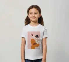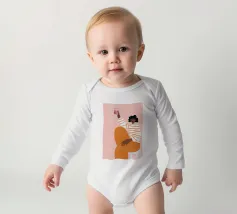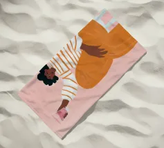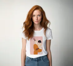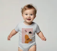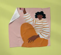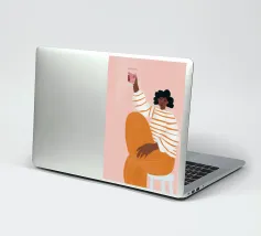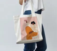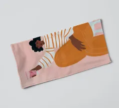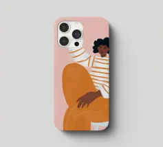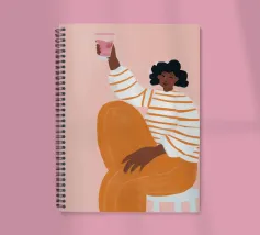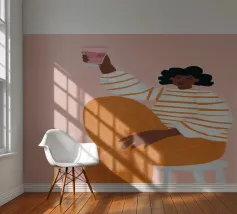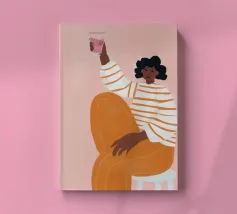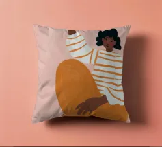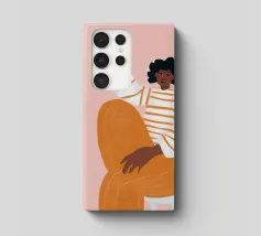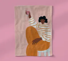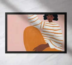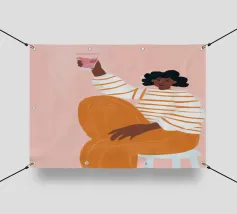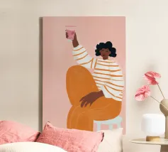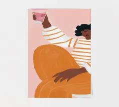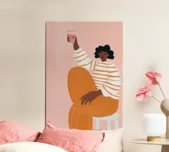 Una donna elegante in pantaloni a righe e un semplice top siede in una posa rilassata, tenendo in mano una tazza rosa. L'opera d'arte cattura un momento informale di chic moderno e senza sforzo e di confortevole solitudine.