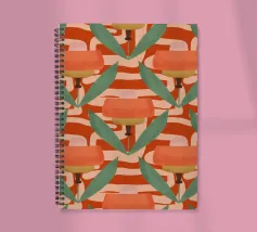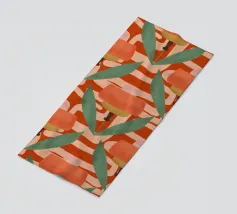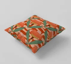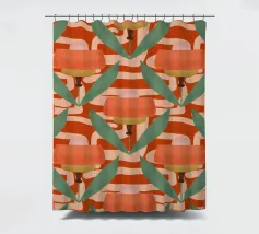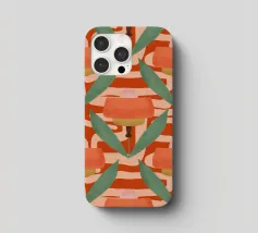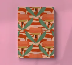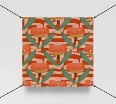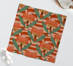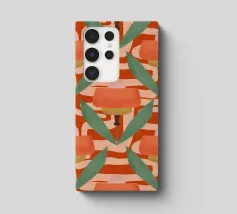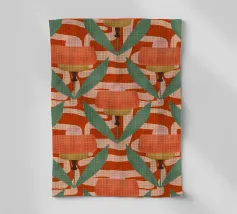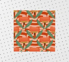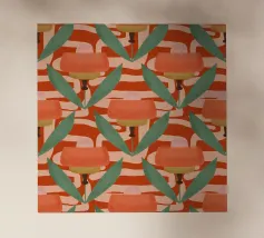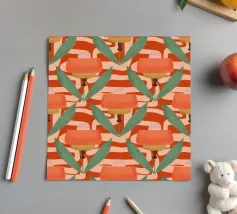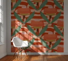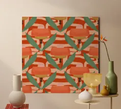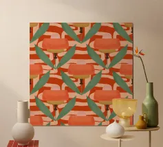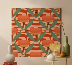 Fiore d'ispirazione moderna di metà secolo, con papaveri, foglie in grassetto e sfondo a griglia retrò nei toni smorzati dell'arancione, del verde e del beige.