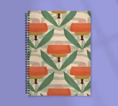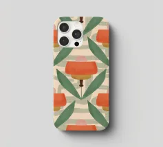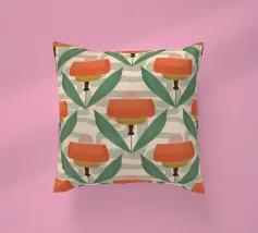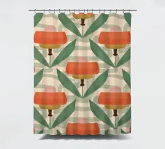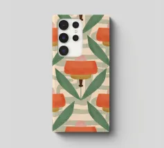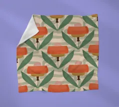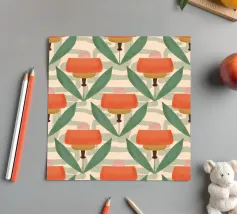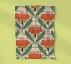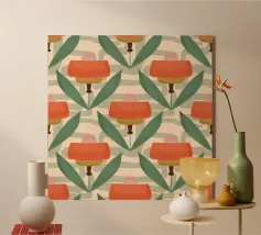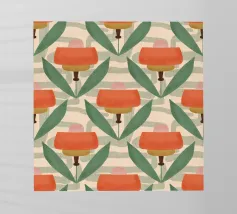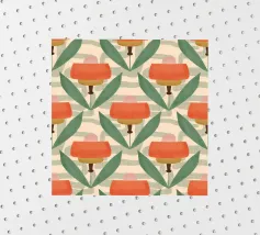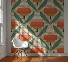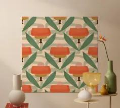 Fiore d'ispirazione moderna di metà secolo, con papaveri, foglie in grassetto e sfondo a griglia retrò nei toni smorzati dell'arancione, del verde e del beige.
