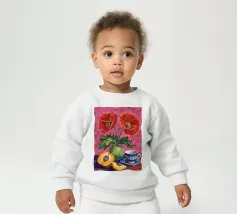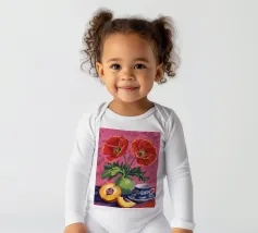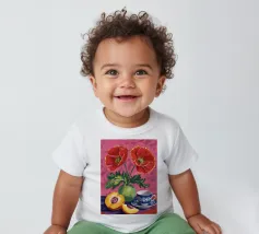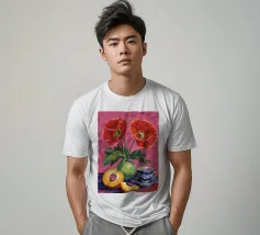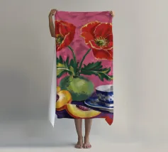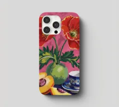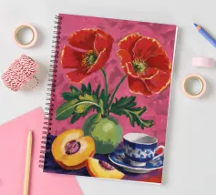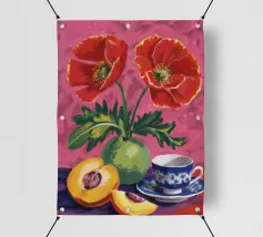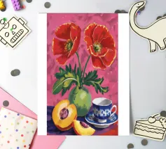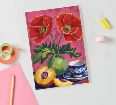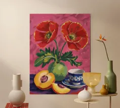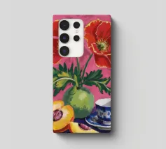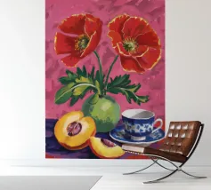 Natura morta di papaveri rossi in un vaso accanto a una tazza da tè e a un piattino a fantasia, con una pera e un'albicocca. Lo sfondo rosa e la bella composizione creano una scena di incantevole e pacifico riposo.