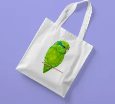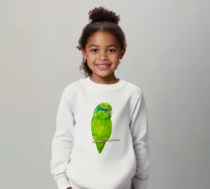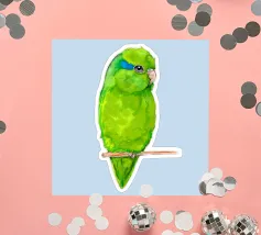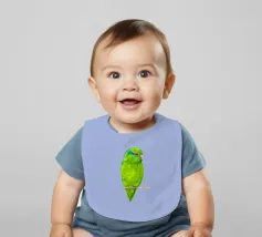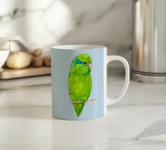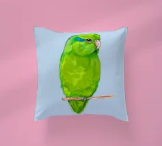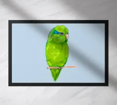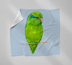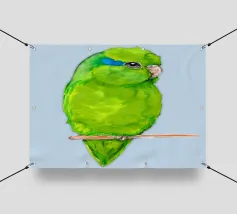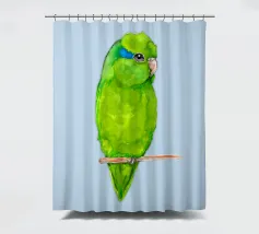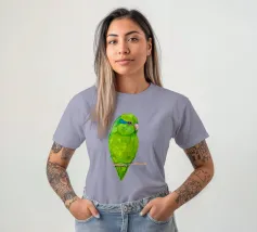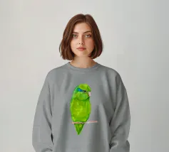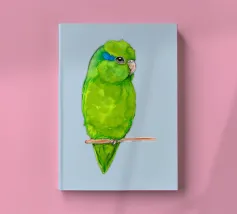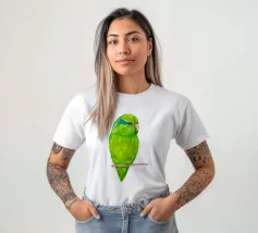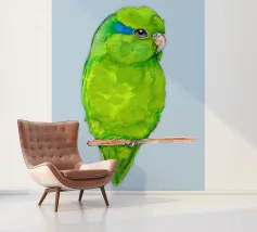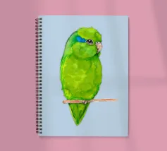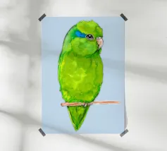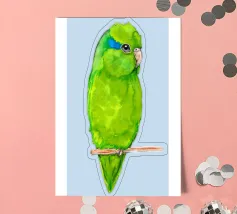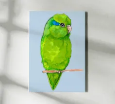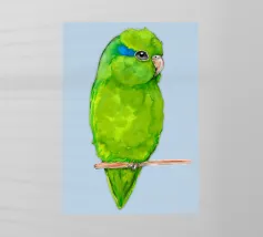 Acquerello di un pappagallino verde. Si appollaia comodamente su una zampa. I pappagallini sono i più piccoli.