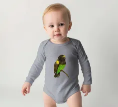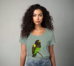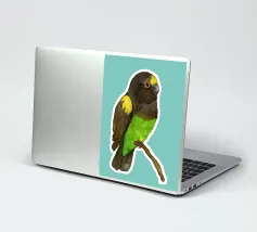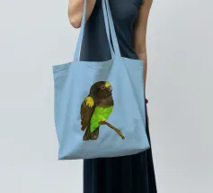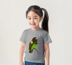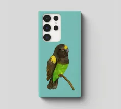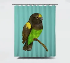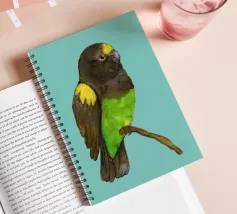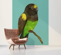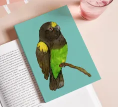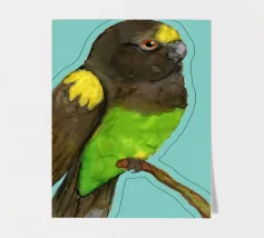 Disegno ad acquerello di un pappagallo di Meyer. Questo uccello marrone-verde con macchie gialle è seduto su un ramo. L'uccello siede tranquillamente su una zampa e vi guarda dolcemente con un occhio.