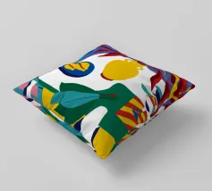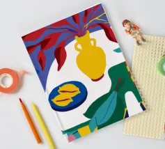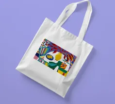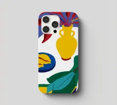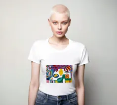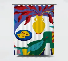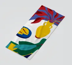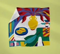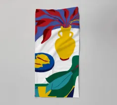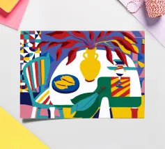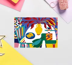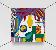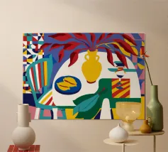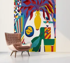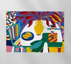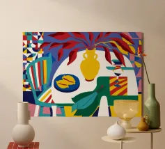 Una vivace natura morta astratta con una palma in un vaso su uno sfondo a strisce colorate. La composizione è una celebrazione giocosa, grafica e tropicale del paradiso.