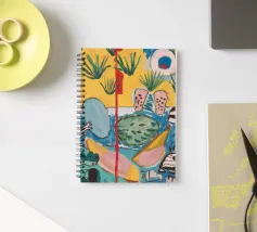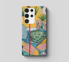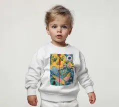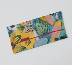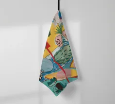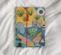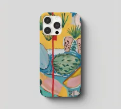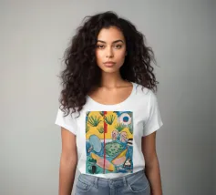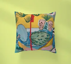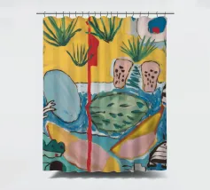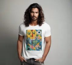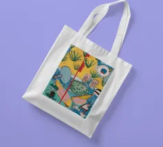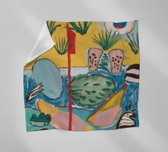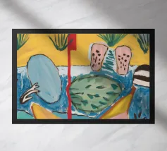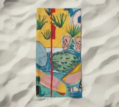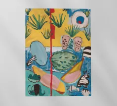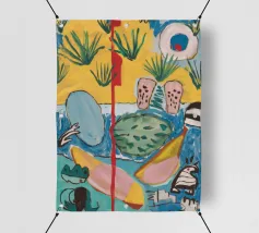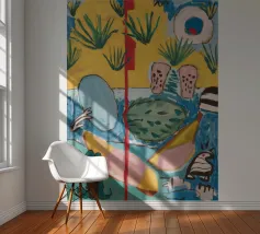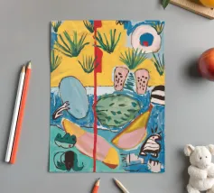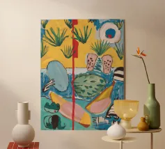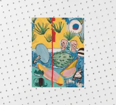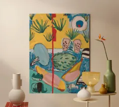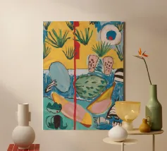 Un dipinto astratto colorato con varie forme e motivi, tra cui palme e disegni geometrici. La composizione dinamica crea un senso di movimento ed energia.