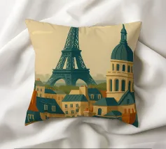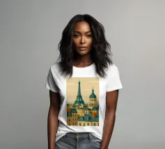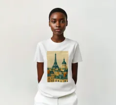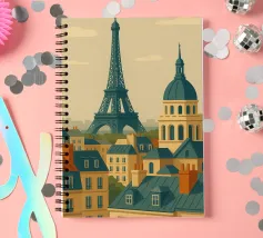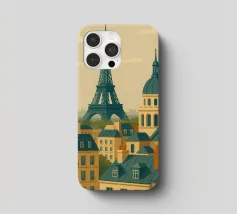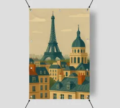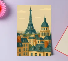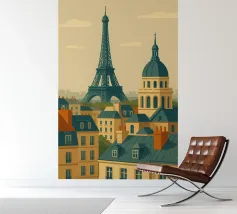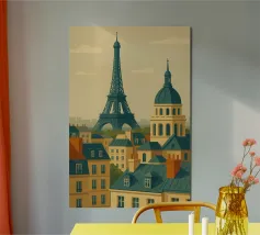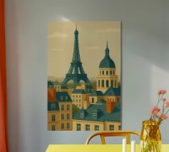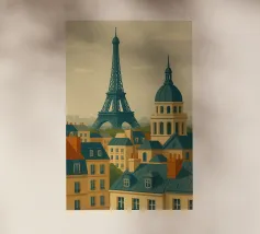 Una Parigi morbida e senza tempo, immersa in una luce dorata. La Torre Eiffel, i tetti bluastri e le cupole parigine si allineano in una composizione elegante e nostalgica. Un poster che cattura l'eleganza grafica della capitale.