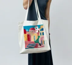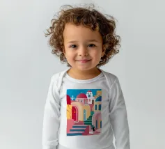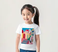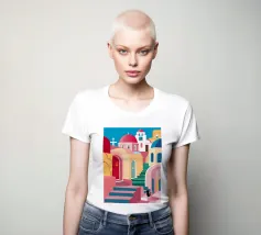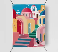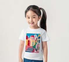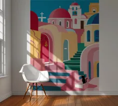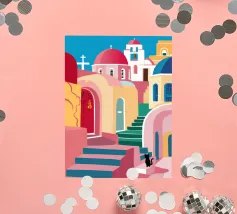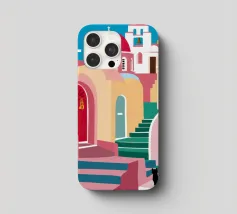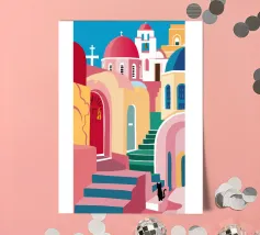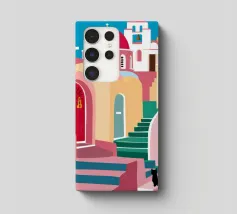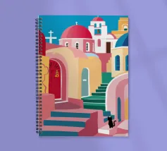 Una vivace scena di strada in una città mediterranea con edifici colorati, gradini rossi e un piccolo gatto nero seduto a osservare il mondo.