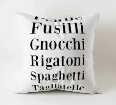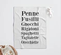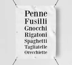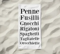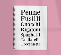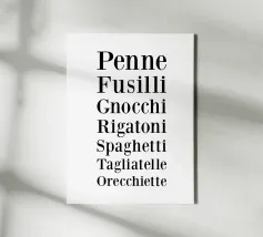 Questa illustrazione è un omaggio elegante e moderno alla diversità della pasta! Il testo mostra un elenco verticale di varietà classiche di pasta, elegantemente disposte in una tipografia chiara e decisa su uno sfondo bianco. Con la sua estetica minimalista, il design emana un'eleganza senza tempo, sia informativa che decorativa. Penne, fusilli, gnocchi, rigatoni, spaghetti, tagliatelle, orrechiette